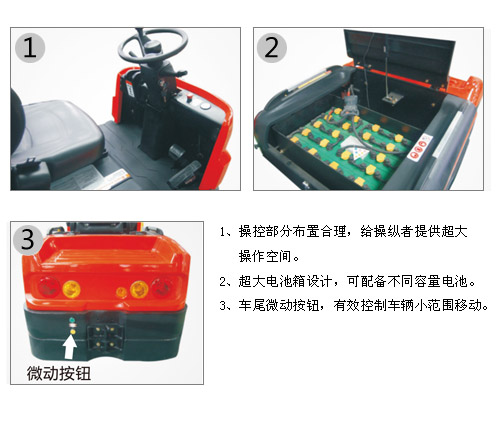 · 三支点坐驾式电动牵引车可大幅度开启电池箱盖,方便日常维护保养